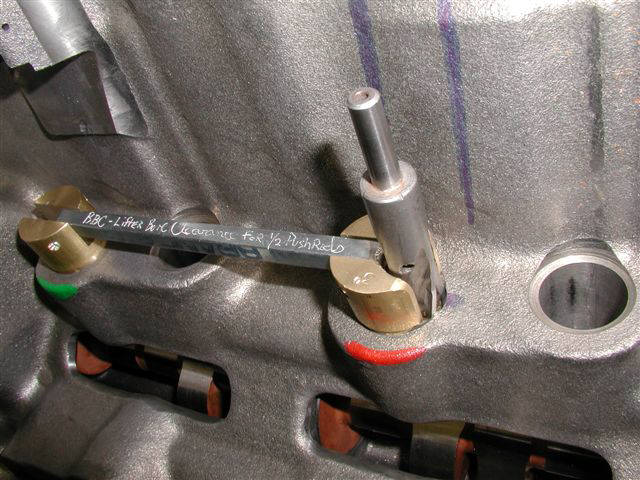 Clearancing for pushrod clearance - Big Chief BBC Bill Jones' Photo Gallery Page 13 When trying to get .970" lift on a BBC with 14º big chief heads and trying to use the large diameter pushrods----the bottom of the pushrods interfere with the edges of the lifter bore because of the offset pushrod seats in the roller lifters.