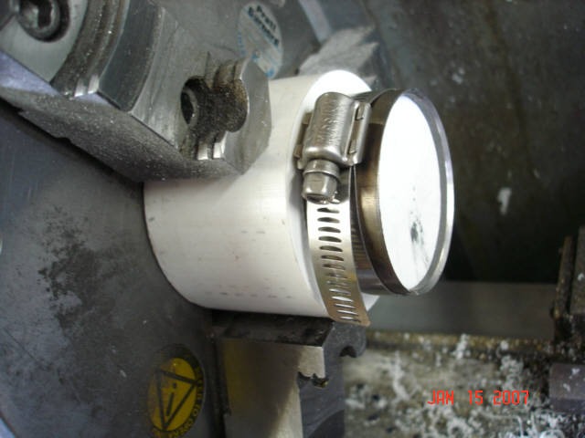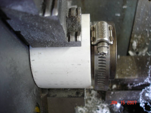 -The bearing shells need to just slightly expand to snap onto a 2.285" diameter snout---which is sort of nice because you can just pop'm on there and they stay put while you install the hose clamp. -I put the step back at .710" and that leaves you enough room to get your lathe tool in there and to be able to see all of the chamfered area. -The OD of the fixture needs to be 2.375" as a minimum for the step. -Took about 5 minutes to make the fixture and chamfer the one pair of shells. -------------------------------------------------------------------------------------- -Years ago I took 3 sizes of Chevrolet rods-----cut the beams off with a bandsaw and ground'm sort of smooth----chucked each rod up in the lathe and machined the outside side edges of the rods round----to where I had enough an area to grip'm in my lathe jaws. -Then I tack welded the head of the rod bolts to rods---removed the nuts & the rod caps and cut the bolt off to where I had about 7/16" of the rod bolt left to act as a dowel for the rod cap. -Those have served me well for 30 years. ------------------------------------------------------------------------------------- -The only problem with the larger diameter of the plastic part is there is gap which means that if you wanted to do a hand scrape with a deburr tool you wouldn't be able to.