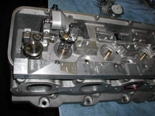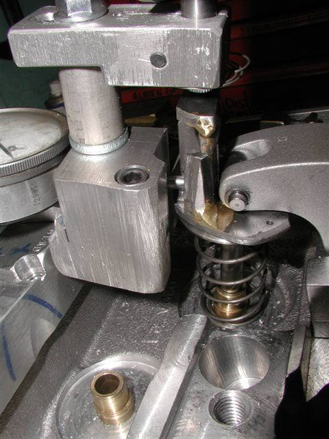 -the long bar was bolted to the valve cover rail---then the head was installed on my mill---tilted to the get the exhaust valve straight up---then I machined a slot to allow a mounting place for the dual dial indicator mount and a mounting hole was drilled and tapped.
