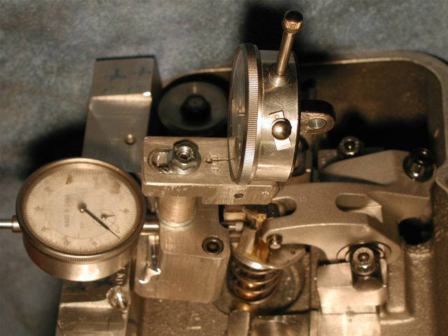 -the vertically mounted dial indicator tip presses down with a light spring to sort of hold the C washer stand from tipping backwards as the roller tip moves to an open position where the vertical indicator tip then tries to tip the C washer stand over backwards.